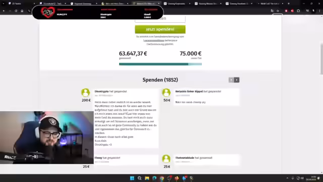 02:50:39Der Streamer startet die 'Spenden-Genki-Dama' und zählt rückwärts. Die Community reagiert mit einer enormen Welle an Spenden. Innerhalb weniger Minuten steigt die Spendensumme von 17.171 Euro auf über 20.000 Euro an. Der Streamer zeigt sich sichtlich überwältigt und schockiert von der Reaktion seiner Zuschauer und der Höhe der Beträge, die einige Einzelne spenden. Er nennt spezielle Spender wie 'Obstnascher' mit 500 Euro und 'Kapound1987' mit 1.000 Euro und feiert den Zusammenhalt der Community.