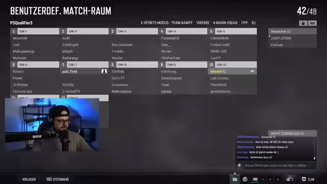 00:40:24Im Anschluss an die allgemeinen Begrüßungen stellt der Streamer das eigentliche Event vor. Es handelt sich um das erste Creator Wars PUBG-Turnier. Er stellt sein Team vor, das aus ihm selbst, Krokoboss, xthesolutiontv und einem ihm unbekannten Spieler namens Prime Vladi besteht. Offen wird über die unzuverlässige Anwesenheit von Teammitgliedern und die damit verbundenen logistischen Schwierigkeiten für das Turnier gesprochen.