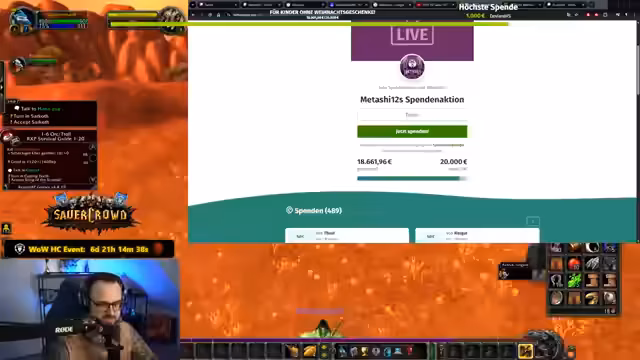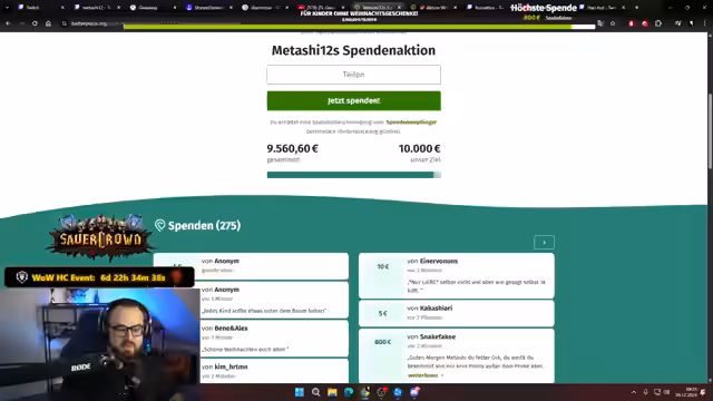 09:19:47Dieser Abschnitt ist stark von der Charity-Aktion geprägt. Das Spendenziel wird auf 45.000 Euro angepasst, da das alte Ziel bereits übertroffen wurde. Es folgt die Ankündigung eines großen Events: dem World of Warcraft Classic Hardcore Livestream. Dieses Event startet am 27. Dezember und dauert 16 Tage ununterbrochen. Es wird von Metashi 12 und einer Gruppe von Gefährten durchgeführt und soll eine dramatische und epische Saga für Twitch und die WoW-Community darstellen.