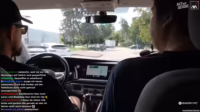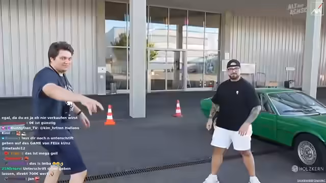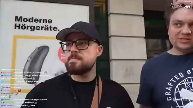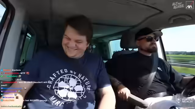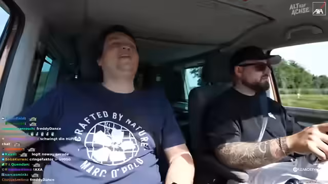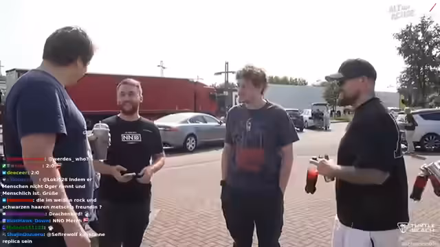 01:56:51Es wird über übergroße Füße und die Schwierigkeit, passende Markenschuhe zu finden, gesprochen. Ein Teilnehmer erzählt von einem teuren Versace-T-Shirt, das schnell kaputt ging, und seitdem keine Markenkleidung mehr kauft. Die Schuhgrößen im Chat werden verglichen und festgestellt, dass es viele "Bigfoot" gibt. Die Standard-Schuhgröße für Männer und Frauen in Deutschland wird diskutiert. Ein Teilnehmer erzählt, dass er immer sehr dünn war und zu faul war, sich neue Schuhe zu kaufen. Es wird über ein Ninja Warrior Training gesprochen und der Respekt vor den fingerfertigen Fähigkeiten eines Teilnehmers ausgedrückt. Dieser hatte einen TV-Auftritt in der Show "Mein Mann kann". Es wird über die TV-Total TV-Box von früher gesprochen und wie ein Teilnehmer dort mit seinen Daumen gewackelt hat. Es wird über Lego und das Abseits des Computers gesprochen. Die Gruppe muss sich beeilen, da die Solo-Tour wartet. Ein Teilnehmer hat viele Fakten und will nichts mitnehmen. Es wird über ein Mitbringsel diskutiert und wer was abnehmen muss. Jan gefällt es mit langer Hose, obwohl es warm ist. Die Gruppe sieht ein cooles Auto und will ein Bild machen. Sie werden von BMW Klasse angesprochen und um ein Foto gebeten. Die Gruppe steigt ins Auto und will Content machen. Es wird über den aktuellen Standort (Löhne) gesprochen und die Community gegrüßt.