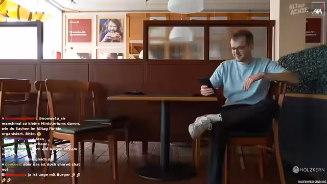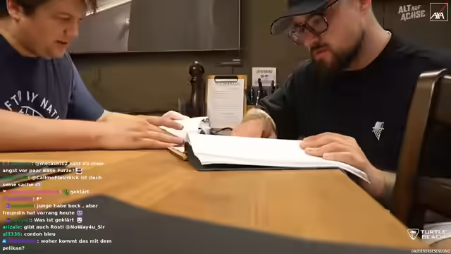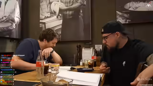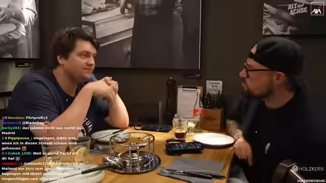 09:11:52Es wird über einen Spoiler im Chat diskutiert, der sich auf das G2 gegen Kissy Spiel bezieht, dessen Gewinner zu den Worlds fährt. Es besteht die Sorge, dass G2 möglicherweise zum ersten Mal seit langer Zeit nicht an einem internationalen Turnier teilnehmen könnte. Der Fokus verschiebt sich auf Essensbestellungen, wobei Cola Zero für Tobias geordert wird, der als 'härtester Mitarbeiter' bezeichnet wird. Es wird betont, dass alle außer Mitasche eingeladen sind. Diskussionen über das Mikrofon folgen, wobei festgestellt wird, dass es bei Mitasche schlechter funktioniert. Der Chat wird nach seiner Meinung zum Ton gefragt. Kleine Käseplatten werden dankend entgegengenommen, bevor das Hauptgericht bestellt wird. Es wird überlegt, ob noch eine Käseplatte und Brot bestellt werden sollen.