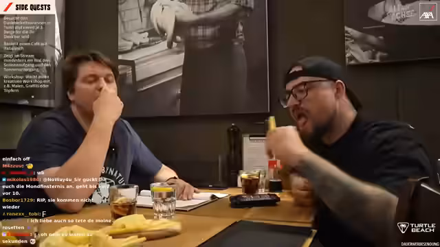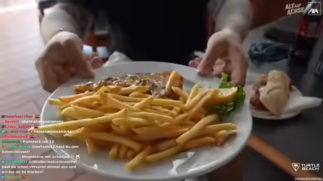 10:03:57Es wird über das Essen und die bereits verzehrte Menge diskutiert, wobei der Streamer gesteht, viel gegessen zu haben und eine Pause benötigt. Es folgen Bemerkungen über die Verdauung und die Beschaffenheit des Stuhlgangs, die ins Detail gehen. Die Runde scherzt über mögliche unangenehme Folgen des Essens und vergleicht diese humorvoll mit verschiedenen Szenarien. Es wird ein Spaziergang zur Verdauung vorgeschlagen, eventuell kombiniert mit einem Schnaps. Die Diskussion schweift ab zu verschiedenen Themen, darunter Waliser Trockenwurst und Ofenkäse. Der Streamer äußert sich über Völlegefühl und Schweißausbrüche nach dem Essen. Es folgen Vergleiche mit Erfahrungen bei Fast-Food-Ketten. Die Gesprächspartner zitieren ein virales Video und machen anzügliche Bemerkungen.