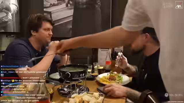 09:17:18Es wird diskutiert, ob eine oder zwei Portionen Käsefondue bestellt werden sollen, da es erst ab zwei Portionen erhältlich ist. Freddy bietet an, dass andere vom Tisch probieren dürfen. Es wird überlegt, das Lötschbergfondue mit gedämpften Kartoffeln zu kombinieren. Die Frage, was man in das Fondue dippt, wird beantwortet: Brot, Kartoffeln und Gurken. Eine Anekdote über eine frühere Erfahrung mit Fondue und ein darauf folgendes Schweiz-Verbot wird erzählt. Es wird erklärt, wie man korrekt aus dem Fondue isst, um Speichelkontakt zu vermeiden. Die Bestellung wird angepasst, wobei die Menge der Kartoffeln diskutiert wird. Vanessas Essgewohnheiten werden thematisiert, insbesondere ihr Motto, alles zu probieren, bevor der Verdauungsprozess einsetzt. Freddy gesteht ein früheres Alkoholproblem und erklärt, warum er jetzt vorsichtiger ist. Eine Geschichte über einen gemeinsamen Korea-Trip mit übermäßigem Alkoholkonsum wird erzählt.