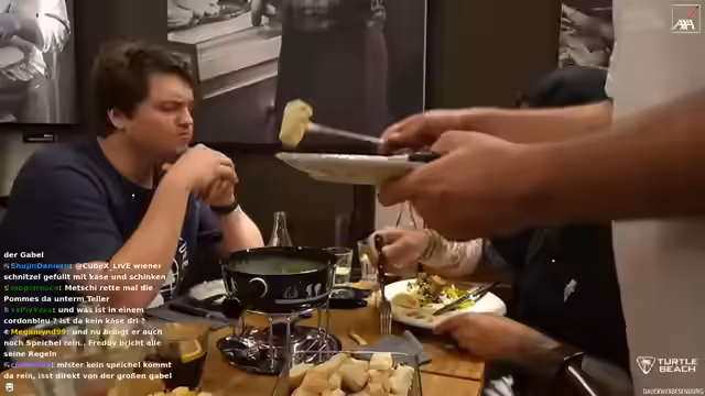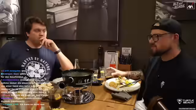 09:03:07Es wird beschlossen, zwei Käseplatten als Vorspeise zu bestellen, da alle sehr hungrig sind. Es wird überlegt, wer welches Mikrofon hat. Es wird über die Vorfreude auf den Käse gesprochen. Es wird über die Arbeit gesprochen. Es wird überlegt, wer die Getränke bezahlen soll. Es wird überlegt, ob man das Fondue für 10 nimmt, wenn man zahlt. Es wird über das Cordon Bleu gesprochen. Es wird über die Anzahl der Furze während der Fahrt gesprochen. Es wird über die Erlaubnis gesprochen, den Stream früher anzumachen und jemanden zu wecken. Es wird überlegt, ein anderes Spiel zu spielen. Es wird überlegt, wo man sich hinsetzen soll. Es wird überlegt, was man nehmen soll. Es wird überlegt, ob man das Fondue so zeigen soll. Es wird überlegt, ob man das Handy reparieren soll. Es wird überlegt, ob man das Kabel reparieren soll. Es wird überlegt, ob man das Fondue bestellen soll. Es wird überlegt, was man trinken soll.
