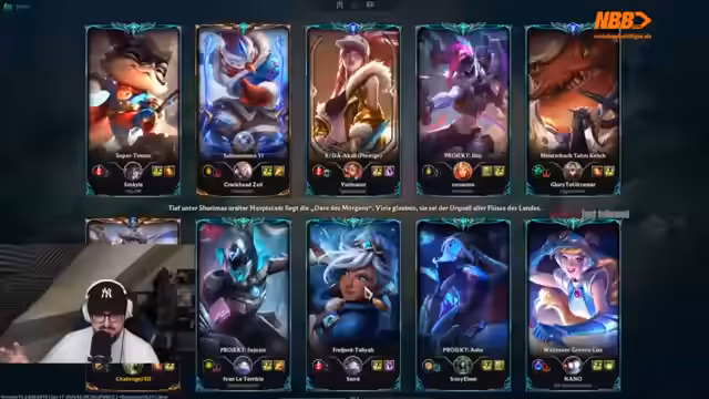 04:52:50Der Streamer spielt ein League of Legends-Game auf der Top-Lane mit dem Champion Kassadin. Nach einer holprigen Anfangsphase, die als "gefickt" beschrieben wird, entwickelt sich die Runde positiv. Es werden die Mitspieler und diverse Unterstützer im Chat erwähnt, darunter eine "20-Mann-Sub-Bombe". Es wird eine Diskussion über den stärksten Counter für Kassadin geführt, wobei sich der Streamer trotz Bedenken für den Champion Trundle entscheidet.