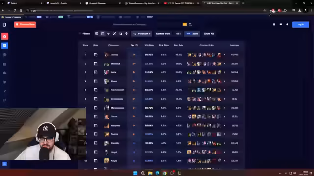 02:22:01Es wird überlegt, Darius zu bannen und die Vorliebe für dessen Hinterteil wird humorvoll erwähnt. Es wird ein Warwick-Bun erwähnt. Toxicato wird für zwei Monate Prime gedankt. Es wird überlegt, welchen Champion man gegen Urgott wählen soll. Es werden verschiedene Counter-Picks wie Kale, Trundle, Wukong, Klett, Cassiopeia, Olaf und Kennen diskutiert. Es wird festgestellt, dass Riven keine Option ist, da der Streamer schlecht mit ihr ist. Timo wird aufgrund seines geringen Impacts im Endgame ausgeschlossen. Urgott wird als schwieriger Gegner angesehen. Es wird sich überlegt, ob Garen eine gute Wahl wäre, aber es wird verworfen, da der Streamer dachte, Olaf wäre Garen. Es wird festgestellt, dass die Bot-Lane verloren ist und auf einen Sieg gehofft.