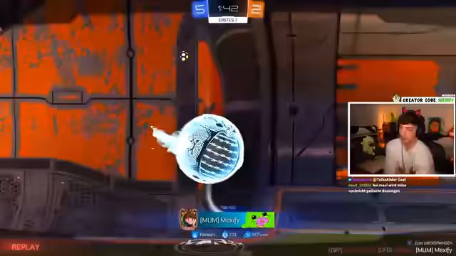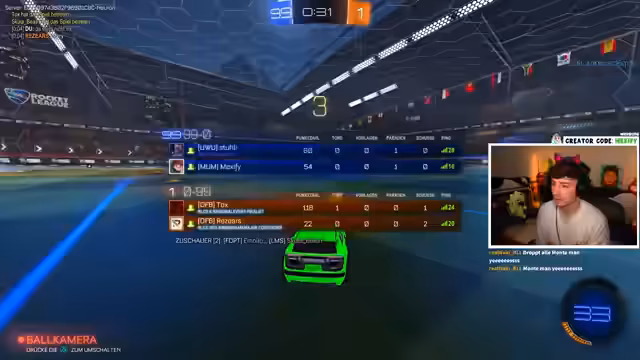 01:34:36Die Rocket League-Runde beginnt im Heatseeker-Modus gegen Tox und Rezears. Der Streamer und sein Partner, Stuhli, stellen schnell fest, dass ihre Gegner weit überlegen sind und als sogenannte 'Smurfs' eingestuft werden können. Trotz ihrer Bemühungen, Tore zu erzielen, werden sie klar geschlagen. Der Streamer zeigt Respekt für das hohe Skill-Level der Gegner, während sein Team eine Niederlage einsteckt.