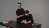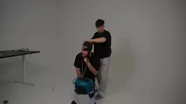 00:54:26Der Fokus verlagert sich auf Zahnaufhellungsstreifen. Vor dem Test wird mit einem Skala die Zahnfarbe der Tester gemessen, die als eher gelb eingestuft wird. Daraufhin werden die Bleachingstreifen auf die Zähne geklebt, wobei das Anlegen der Streifen als unangenehm und komisch empfunden wird. Danach wird ein Nackenmuskel-Trainer getestet, der für mehr Masse im Nackenbereich sorgen soll, auch wenn dies als ungewöhnlich und potenziell schmerzhaft beschrieben wird.