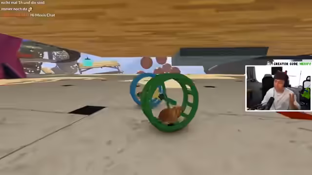 00:03:33Die Spieler starten das kooperative Gameplay. Es geht darum, gemeinsam einen Hamster durch ein Hamsterrad zu steuern, wobei einer blau und der andere grün ist. Die erste Zeit ist geprägt von Versuch und Irrtum, da die Kommunikation über fehlgeschlagene Aktionen läuft. Die Protagonisten scheitern an den ersten Hürden und müssen sich gegenseitig motivieren, die Zusammenarbeit anzugehen. Die ersten Checkpoints werden erreicht, was kleine Erfolge bringt, aber die Steuerung bleibt eine ständige Herausforderung.