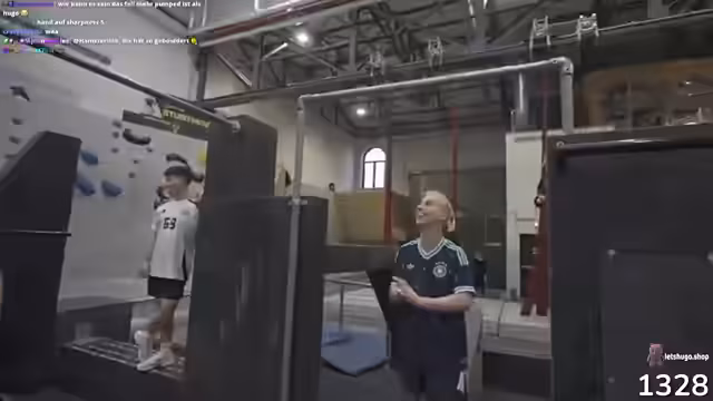 01:18:05Nach der Staffel-Challenge wird eine weitere, schwierigere Strecke gezeigt, die aus dem Balancieren auf einem schmalen Hangelbrett besteht. Streamer mexify sieht hier seinen Fortschritt im Vergleich zum Vorjahr, ist sich aber der Gefahr bewusst. Für das Publikum wird eine einfachere Variante vorgeführt. Anschließend stellt mexify die finale Herausforderung vor, ein „Bundle“, bei dem mehrere Elemente wie Rampensprünge und Hangeln kombiniert werden müssen. Um den Stream dynamisch zu gestalten, kündigt mexify an, dass er versucht, eine bestimmte Challenge zu meistern, bei der man direkt von einer Stange zur nächsten springen muss, was als äußerst anspruchsvoll und gefährlich gilt.