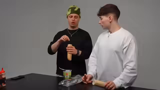 00:47:38Nach den enttäuschenden Getränken wechselt der Streamer zu Essig-Spezialitäten. Es werden Produkte von Mark Gebauer, eine Mayo, eine Würstchen-Chili-Majonaise und eine Hot Sauce getestet. Der Streamer preist die Mayo als lecker und seine persönliche Lieblings-Mayo, die er gerne auf Reis oder Snacks verwendet. Während die Mayo positiv aufgenommen wird, kommt es bei der Öffnung der anderen Produkte zu technischen Schwierigkeiten, wie einem defekten Verschluss und einem Messer, das abgebrochen ist. Der Co-Streamer musste sich die Hand verletzen, was die Stimmung trübt und den Fokus auf die praktischen Aspekte der Produktpackung lenkt.