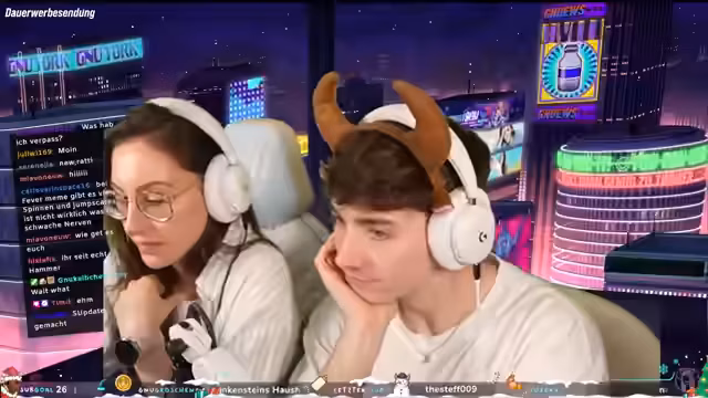 00:55:41Für die zweite Hälfte des Streams wählen sie ein Horror-Game, 'Sussy Impostor'. In diesem Jump'n'Run-Game müssen sie Hindernisse überwinden und eine Tutorial-Map meistern. Der Streamer und Maxi haben mit der Logik des Spiels zu kämpfen, da sie oft falsche Entscheidungen treffen und dadurch scheitern. Die Ablenkung durch den Chat und die teilweise unfairen Gameplay-Mechanik sorgen für zusätzlichen Stress und Frust.