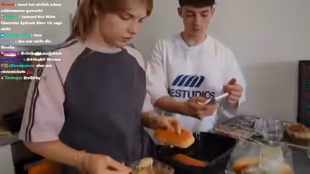 01:39:05Der Streamer beginnt mit dem Braten des Hackfleischs in der Pfanne und diskutiert mit dem Chat über die richtige Temperatur und Menge an Öl. Er stellt fest, dass die Pfanne sehr heiß wird und dass das Hackfleisch scharf angebraten werden muss, um Röstaromen zu erzeugen. Nachdem das Hackfleisch fertig ist, wird es mit Käse bedeckt und für kurze Zeit in den Ofen geschoben, damit der Käse schmilzt. Der Streamer probiert das fertige Gericht und äußert sich positiv über den Geschmack, kritisiert aber die Optik, da die Burger ein wenig verkackt aussehen.