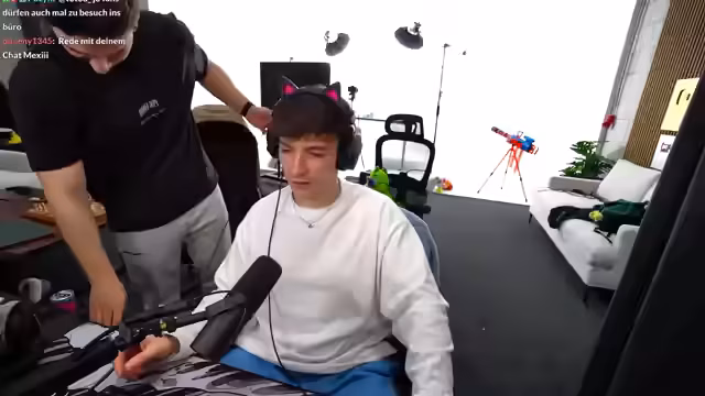 00:43:57Der Streamer zeigt beeindruckt das professionelle Streaming-Setup des Ortes, das aus mehreren Kameras, Mikrofonen und professionellem Licht besteht. Währenddessen tauschen sich die beiden über persönliche Anekdoten aus. Der Streamer erzählt von einem Treffen auf der Gamescom, bei dem er im Dino-Kostüm unter extremen Temperaturen arbeiten musste, und diskutiert über den Druck, der auf anonymen YouTubern lastet.
