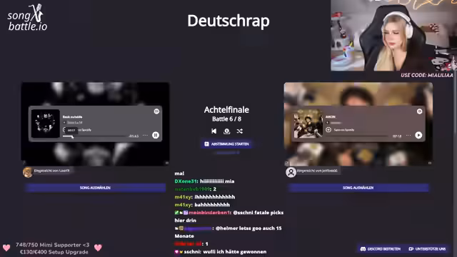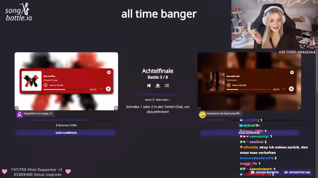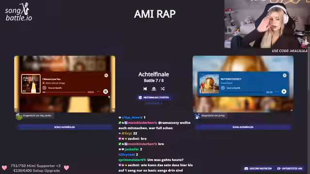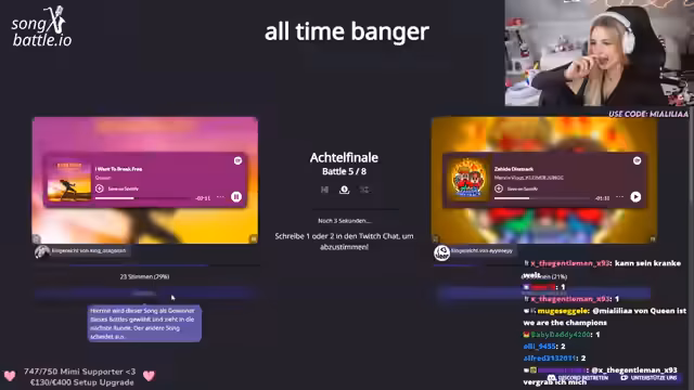 01:40:54Das Songbattle-Tournament schreitet voran, mit mehreren Runden und Paarungen. Die Streamerin moderiert die Abstimmungen, bei denen die Zuschauer entscheiden, welcher von zwei Songs weiterkommt. Einige Songs sind ihr bekannt, andere nicht, was die Abstimmungen spannend gestaltet. Es gibt technische Zwischenfälle, wie eine abgebrochene Abstimmung, aber das Turnier wird fortgesetzt. Die Teilnehmerzahlen variieren, und einige Runden enden knapp mit nur einer Stimme Differenz.