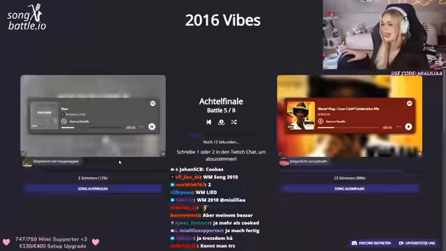 02:09:24Nach der Präsentation des Bananenbrots wird das Songbattle-Tournament fortgesetzt, diesmal mit dem Thema '2016 Vibes'. Die Streamerin bittet die Zuschauer, passende Songs aus diesem Jahr einzusenden und führt mehrere Runden durch. Es gibt einige technische Unregelmäßigkeiten und Diskussionen über die Songwahl, aber das Turnier wird erfolgreich abgeschlossen. Die Streamerin bewertet einige Songs als 'Banger' und zeigt sich begeistert von der Teilnahme der Community.