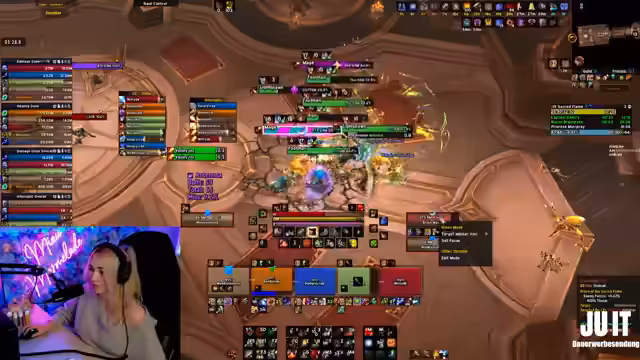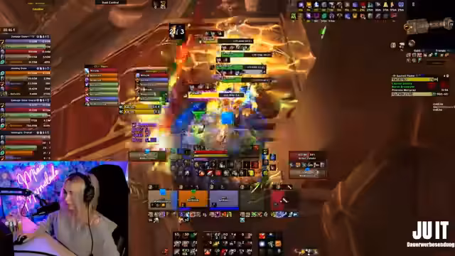 02:00:21Die Gruppe beginnt mit der Ausführung der Bossmechaniken. Es wird darauf geachtet, dass bestimmte Fähigkeiten wie Orbs und Hammer korrekt platziert und gesteuert werden. Die Streamerin interagiert aktiv mit der Gruppe, um sicherzustellen, dass jeder seine Rolle versteht und die Abläufe zeitnah durchgeführt werden. Ziel ist es, den Boss ohne Tode zu besiegen und die Zeit zu halten.