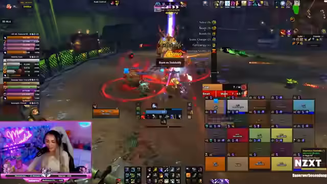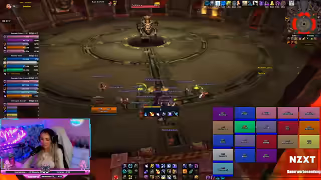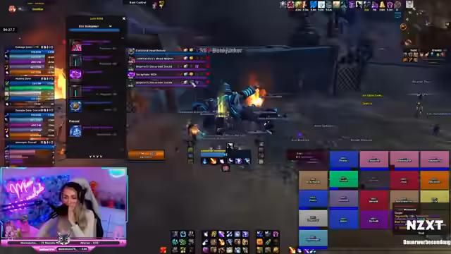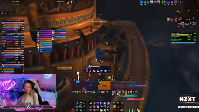 01:26:51Der NHC-Raid beginnt, und die Streamerin ist als Raid-Leader aktiv. Der erste Boss Fulltrottl wird gekillt, aber es kommt zu Problemen beim zweiten Boss. Ein Spieler (Elotax) sterbt, weil er nicht dem Mechanik mit der Energie folgt. Der Raid muss den Tank retten, und es wird viel Bloodlust gezogen. Die Gruppe kämpft mit taktischen Fehlern und muss ihre Positionen anpassen, um den Boss erfolgreich zu besiegen.