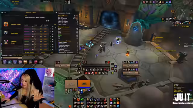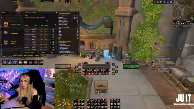 00:32:01Die Streamerin versucht, ihre Ausrüstung zu recraften, um mehr Krit-Chance zu erhalten, stößt jedoch auf Schwierigkeiten, jemanden zu finden, der ihr dabei helfen kann. Gleichzeitig gestaltet sich die Gruppensuche für einen schwierigen Dungeon wie Flatgate als herausfordernd. Sie lehnt das Angebot eines Spielers mit niedrigem Item-Level ab, da der Dungeon selbst mit erfahrenen Spielern schwer zu timen ist. Es wird deutlich, dass sie für bestimmte Dungeons spezifische Klassen wie einen Death Knight (DK) mit Grip-Fähigkeiten benötigt, um ihre Strategie umsetzen zu können. Die Suche nach einem geeigneten Spieler zieht sich hin, und die Streamerin äußert ihren Unmut über die Situation, da sie auf die Unterstützung anderer Spieler angewiesen ist, um ihre Ziele zu erreichen.