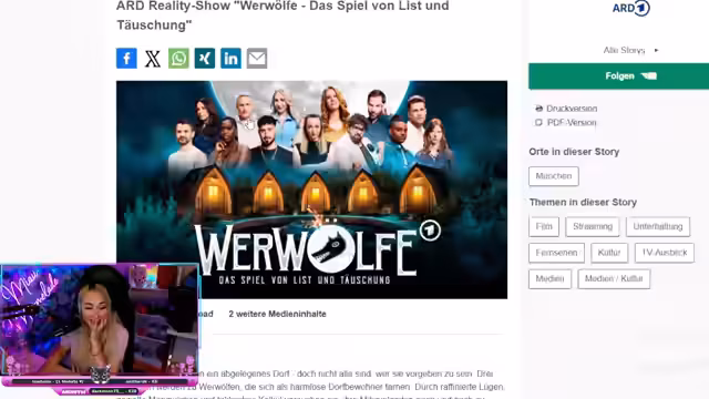 03:34:13Großes Thema ist die Teilnahme am neuen ARD-Reality-Format 'Werwölfe'. Der Streamer erklärt, wie die Anfrage über ihre Agentur kam und dass sie sich beworben hat, da das Format dem Spiel 'Werwölfe vom Düsterwald' ähnelt. Es wird eine Gruppe von 13 Teilnehmern mit außergewöhnlichen Berufen wie Schachweltmeisterin oder Mentalist vorgestellt. Der Streamer äußerte sich sehr begeistert von der Erfahrung, beschreibt das Format als 'geil' und als 'Fulltime-Spiel', bei dem man eine komplett authentische Rolle spielt.