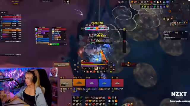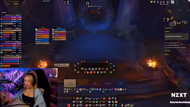 02:12:00Der Stream konzentriert sich auf einen schwierigen Dungeon-Push im Spiel 'World of Warcraft'. Die Streamerin kämpft sich durch einen speziellen Pull, der sie als ihren 'Nemesis' bezeichnet. Sie äußert ihre Frustration über die komplexe Mechanik und den hohen Schaden, den sie erleidet. Obwohl der Pull chaotisch verläuft und ein Gruppenmitglied stirbt, gelingt es ihnen letztendlich, den Dungeon mit knapp verbleibender Zeit abzuschließen, was eine enorme Erleichterung auslöst.