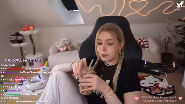 00:00:32Der Stream startet mit einem ausführlichen Gruß an die Chat-Teilnehmer, die liebevoll als 'Zuckerbäckchen' bezeichnet werden. Die Streamerin beklagt leichte Kopfschmerzen, weist auf den baldigen Aufbau ihrer Inhalte auf Snapchat hin und zeigt ihre Freude über den Freitag. Sie stellt sich als 'Streamingmaus' vor und unterhält sich humorvoll über ihr Aussehen, ihren Kaffee und ihr Piercing. Dabei interagiert sie intensiv mit dem Chat, fragt nach dem Befinden und greicht sich einen unpassenden Scherz über einen gelösten Kars-Klaas.
