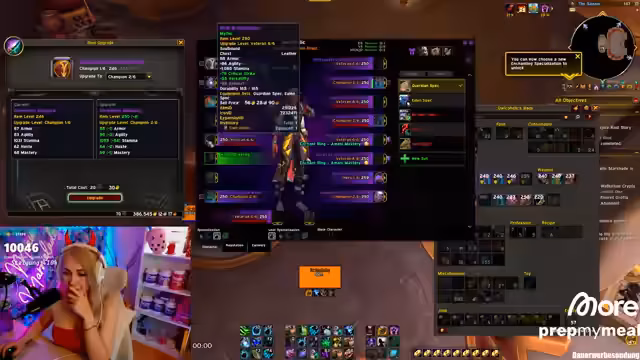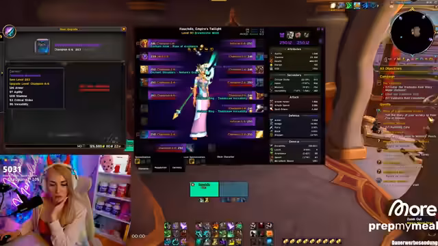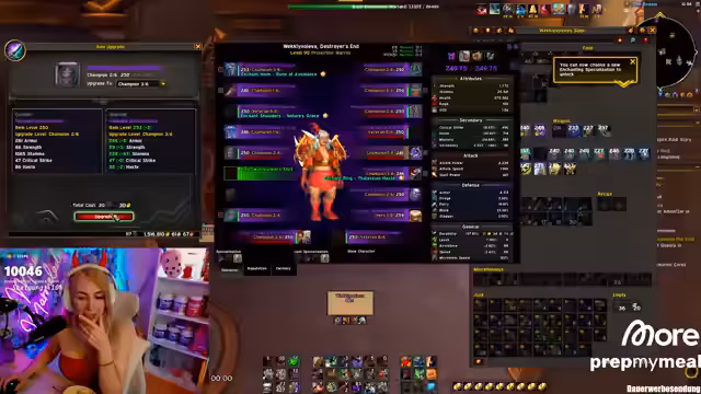 02:20:11Die Streamerin schlägt Corny vor, einen Min-Max Plan für seinen Monk durchzuführen. Zuerst sollen sie Veteran-Items für Bloody Tokens kaufen, diese auf Stufe 250 upgraden, um Champion Crests zu sparen. Anschließend können sie diese Champions Crests nutzen, um Items weiter zu upgraden oder mehr Itemlevel auf dem Monk zu bekommen. Sie müssen dafür nur eine kurze Weekly-Quest erledigen, welche als akzeptabel gilt.
