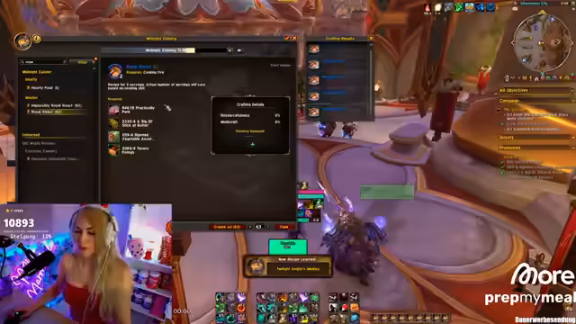 04:24:35Nachdem die Alchemie abgeschlossen ist, wendet sich die Streamerin dem Beruf 'Kochen' zu. Es werden die notwendigen Zutaten und der Rezeptschwierigkeitsgrad erörtert, um 'Hearty Food' herzustellen. Während des Prozesses wird auch ein fehlender Kochhut thematisiert. Parallel dazu werden Pläne für das angestrebte Gameplay für den Rest des Streams besprochen, einschließlich des Farmens von Elva Delves und des Kampfes gegen den Delph-Boss.