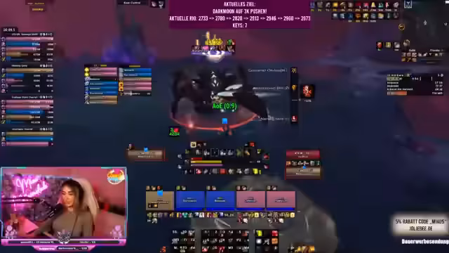 02:51:26Zu Beginn des Streams werden verschiedene Routen für einen Key in Mists of Pandaria diskutiert, insbesondere um Puls 12 zu umgehen. Nach technischen Problemen und einem erfolglosen Pull, bei dem der Frontel verloren ging, wird eine angepasste Route beschlossen, die eine Chain mit dem Priester beinhaltet. Dies geschieht, nachdem ein Spieler den Boss auf 14 getimed hat und als Verstärkung mitgenommen werden soll.