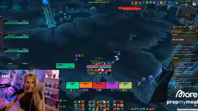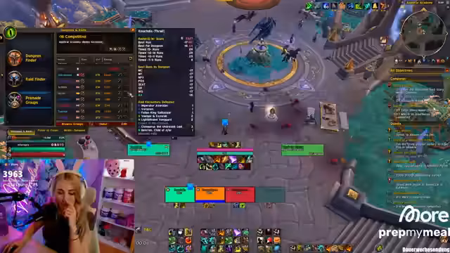 01:01:51Im Verlauf eines 17er-Keys zeigt sich die Frustration über das Management in PUG-Gruppen (Pick-Up-Groups). Der Streamer ist genervt, dass er nicht sehen kann, wer einen Kick oder Stun parat hat, was zu einer chaotischen und ineffektiven Unterbrechung von Fähigkeiten führt. Fehler der Mitspieler, wie Buddy-Pulls oder das Verpassen von wichtigen Kicks, führen zu Toden und einem depleted Mana-Pool. Dies führt zu einer frustrierten Reaktion und dem Verlassen der Gruppe.
