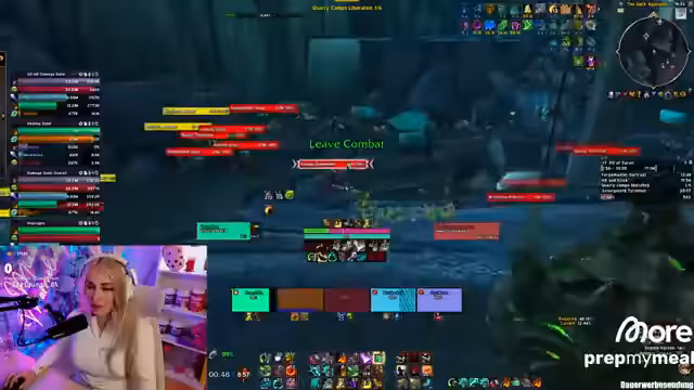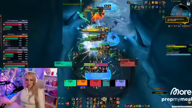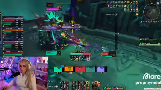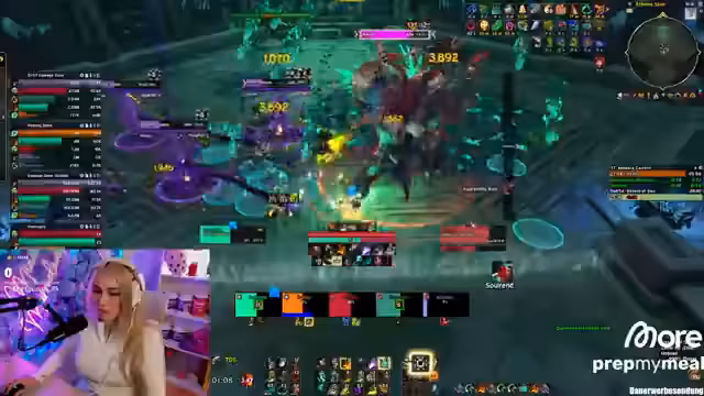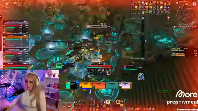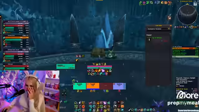 01:55:46Nach technischen Problemen und der Beschäftigung mit der Ernährung, kehrt das Fokus zurück zum Gameplay. Die Streamerin erkennt, dass sie seit Mittwoch ihren neuen mythischen Helm trägt, aber keinen anderen Upgrade für ihre Ausrüstung machen konnte, da sie auf ihre Harz-Crests gespart hat. Sie plant nun, einige Heroic-Crests zu verwenden, um andere Gegenstände wie Ring oder Trinkette zu upgraden. Währenddessen wird ein Schlüssel gespielt, der für den Tank als anstrengend beschrieben wird, da er Berserker im Pull enthält und die Überlebensfähigkeit schwierig macht.