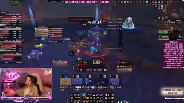 00:52:16Ein Zuschauer möchte wissen, woher ein bestimmtes Transmog-Oberteil stammt, das die Streamerin trägt. Es wird recherchiert, woher das Item stammt und festgestellt, dass es aus einem Dungeon stammt, den die Streamerin nicht erreichen kann. Ein anderer Zuschauer bedankt sich für ein Resub und teilt mit, dass er an Grippe erkrankt ist. Die Streamerin fragt nach dem aktuellen Ziel des Zuschauers im Spiel. Es wird überlegt, ob für den bevorstehenden Dungeon-Run Unsichtbarkeitstränke benötigt werden. Die Streamerin bemerkt, dass sie vergessen hat, einen bestimmten Buff aufzutragen und entschuldigt sich dafür. Es wird eine Strategie für den Dungeon-Run besprochen, inklusive der Reihenfolge, in der bestimmte Gegner angegriffen werden sollen. Die Streamerin äußert sich negativ über einen bestimmten Spec im Spiel und teilt ihre Vorliebe für Riese Droide. Es wird über die Schwierigkeit des aktuellen Affixes im Spiel diskutiert und der Wunsch geäußert, dass dieser für alle Keystufen entfernt wird.