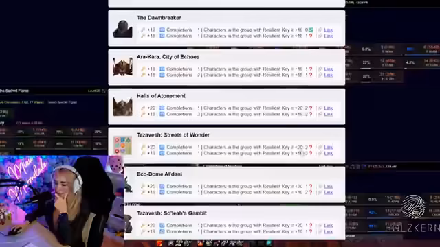 00:10:30Die Streamerin diskutiert das bevorstehende Season-Ende von Warcraft am 20. Januar und äußert Überraschung über den frühen Termin, da sie mit drei Wochen gerechnet hatte, nicht mit einem ganzen Monat. Sie befürchtet, dass sie es nicht mehr in den Cut-Off schaffen wird, da die verbleibende Zeit zu knapp ist. Es wird überlegt, einen 20er Priory-Key neu zu würfeln oder einen 20er Gambit im Tool zu tanken. Die Streamerin erwähnt, dass sie ab dem 7. Januar wieder voll durchstarten kann und dass der Monat bis zum Pre-Patch langweilig werden könnte. Ein 16er Darkbreaker-Key wird in Betracht gezogen, und es wird nach einem 17er oder 18er Resi-Key im Chat gefragt. Es gibt eine kurze Unterbrechung für eine 'Nervositätskacka' vor dem Key. Die Streamerin scherzt über ihren 'sus' Score und gibt einem Zuschauer den Lead, da sich bei ihm bestimmt viele 'Maschinen' anmelden werden. Sie erwähnt, dass Ben heute nicht dabei ist.