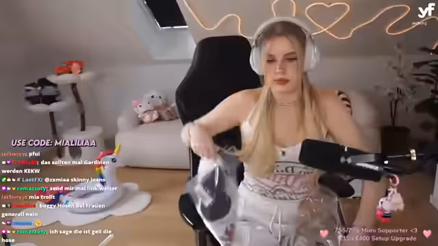 00:36:39Weiter geht es mit einem LFDY-Pullover und einer passenden Hose, die ebenfalls angezogen werden. Die Streamerin berichtet, dass sie für die Hose aufgrund ihrer langen Beinen die Männer-Größe L wählen musste. Beim Anprobieren stellt sie fest, dass die Größe S des Pullovers sehr groß geschnitten ist und diskutiert mit dem Chat über die Passform und mögliche Styling-Optionen wie Croppen oder Kombination mit einem engeren T-Shirt.