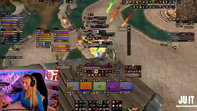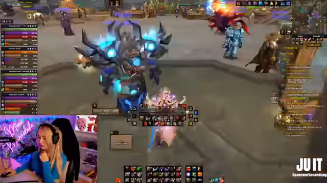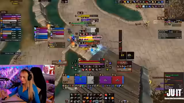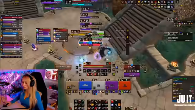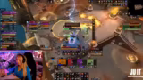 00:29:43Die Streamerin konzentriert sich darauf, den Mythic+ Dungeon 'Floodgate' auf den Level 19 zu bringen und sucht aktiv nach einer Resilient-Priory-Gruppe. Nachdem ein Versuch mit einem Kaufheiler scheitert, probiert sie eine andere Gruppe mit einem Hunter. Trotz eines aussichtsreichen Starts sterben alle Gruppenmitglieder, da der Heiler Shadowmeld-Fähigkeiten genutzt hat. Nach einem erfolgreichen Retry bei einem anderen Boss wird der Dungeon kurz vor dem zweiten Boss abgebrochen.