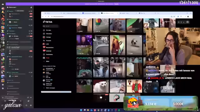 01:12:42Der Streamer durchsucht seine Likes, um ein bestimmtes TikTok zu finden, und erwähnt dabei den Zusammenbruch einer 482-Tage-TikTok-Streak mit 'Feister'. Die Schuld wird humorvoll hin- und hergeschoben. Ein weiteres TikTok mit dem Spruch 'Flitzpiepen' wird als witzig empfunden. Schließlich wird ein Clip von 'Nick' gezeigt, der auf einer Leiche tanzt.