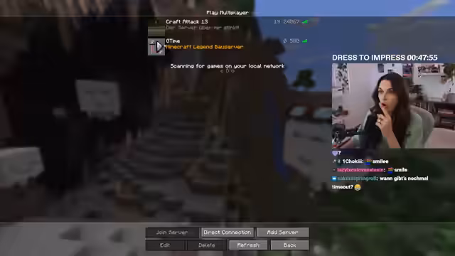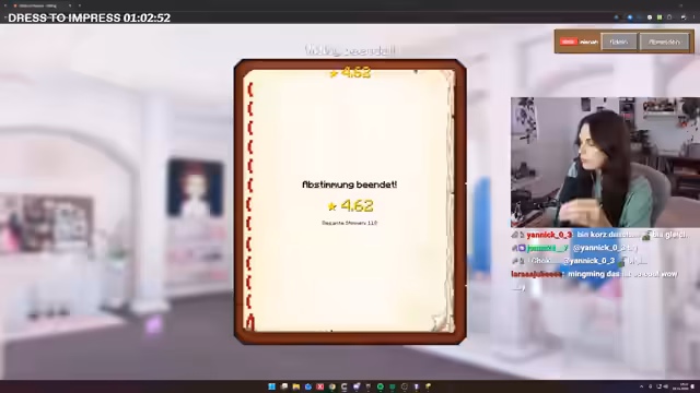 02:25:49Nach langen technischen Schwierigkeiten und Anpassungen des Voting-Systems beginnt das 'Dress to Impress'-Event endlich. Das erste Thema ist ein Klassiker: 'Filme und Serien'. Die Teilnehmer haben fünf Minuten Zeit, um sich einen passenden Skin zu suchen oder zu erstellen. Die Streamerin stellt einen manuellen Timer ein, da der Timer der Website nicht wie erwartet funktioniert. Während die Teilnehmer ihre Outfits vorbereiten, treten weiterhin kleinere technische Probleme auf, wie zum Beispiel das Fehlen des Overlays bei einigen Teilnehmern. Trotz der anhaltenden Herausforderungen ist die Stimmung im Chat und unter den Teilnehmern positiv, und alle sind gespannt auf die ersten Präsentationen. Die Streamerin versucht, die Situation bestmöglich zu managen, um einen reibungslosen Ablauf zu gewährleisten.