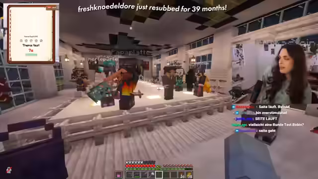 01:12:49Nachdem die technischen Vorbereitungen abgeschlossen sind, führt die Streamerin die Zuschauer virtuell durch das Event-Gelände in Minecraft. Sie zeigt den Catwalk, die Jurysitze, die Zuschauertribüne, die Umkleidekabinen mit Spiegeln und zahlreiche Poster und Dekorationen, die auf das Event vorbereitet wurden. Der gesamte Bereich wurde neu gestaltet und bietet genug Platz und Kulissen für eine abwechslungsreiche Show. Sie demonstriert auch die Wege für die Teilnehmer hinter den Kulissen.