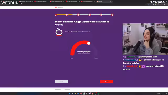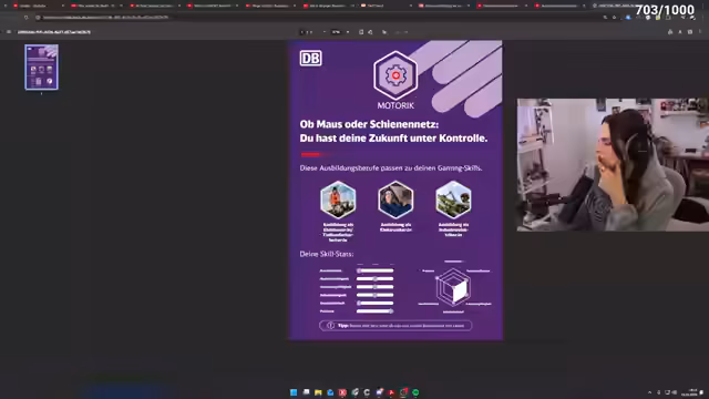 02:03:52Der Stream wird von einem Segment mit der Deutschen Bahn unterbrochen, das deren Ausbildungsplätze bewirbt. Die Streamerin nimmt an einem interaktiven Karriere-Quiz teil, das auf Gaming-Skills basiert. Nach Beantwortung von Fragen zu Spielstilen, Handlungsweisen und Hardware wird das Ergebnis analysiert. Als Top-Match wird der Beruf der Gleisbauerin ermittelt, wobei der humorvolle Kontrast zwischen dem Quizergebnis und der persönlichen Eignung hervorgehoben wird.