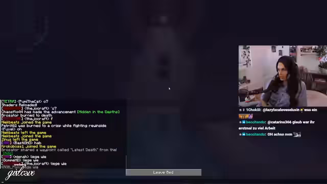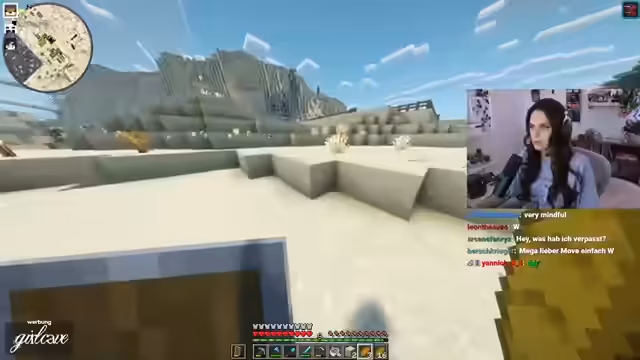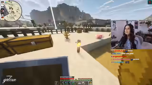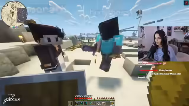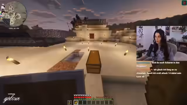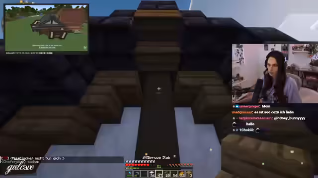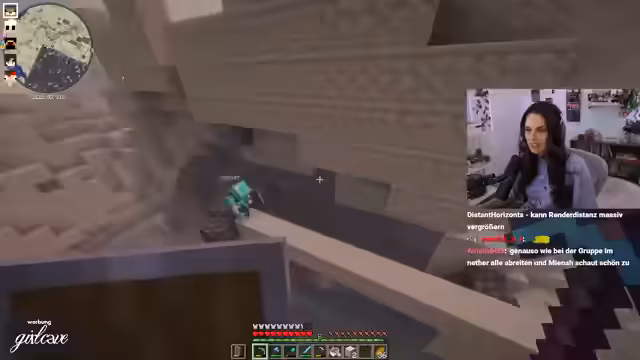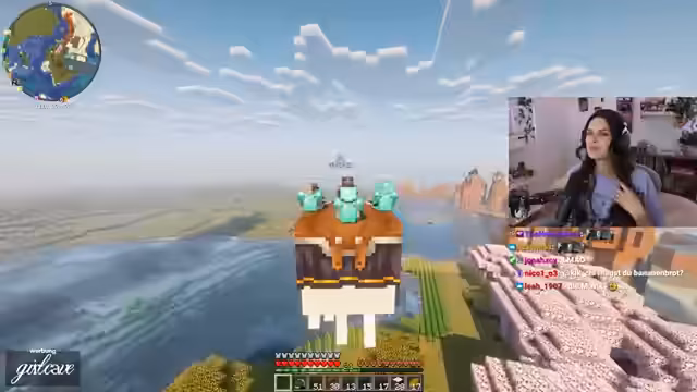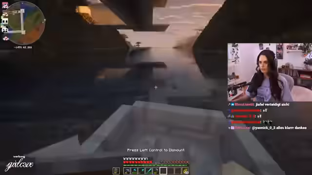 04:44:10Die Streamerin versucht, einen Hopper und eine Laterne zu craften, wird aber von einem Gast, einem fliegenden Mob, abgelenkt. Es kommt zu einer humorvollen Szene, in der sie versucht, den Gast zu besteigen, um zu fliegen. Sie beklagt sich scherzhaft über ihr „fettes BBL“, das sie daran hindert, hochzukommen. Andere Spieler versuchen, ihr zu helfen, den Gast zum Fliegen zu bringen, aber er hat Probleme und fliegt nicht mehr richtig. Es entsteht ein chaotisches Hin und Her, bei dem der Gast immer wieder abstürzt oder in die falsche Richtung fliegt. Die Streamerin und die anderen Spieler versuchen, ihn anzustupsen und zu lenken, um ihn wieder in die Luft zu bekommen. Schließlich gelingt es ihnen, den Gast zu stabilisieren, und die Streamerin genießt den Ausblick von oben. Sie äußert ihre Freude über die schöne Aussicht und die entspannte Atmosphäre, die durch die Musik verstärkt wird.
