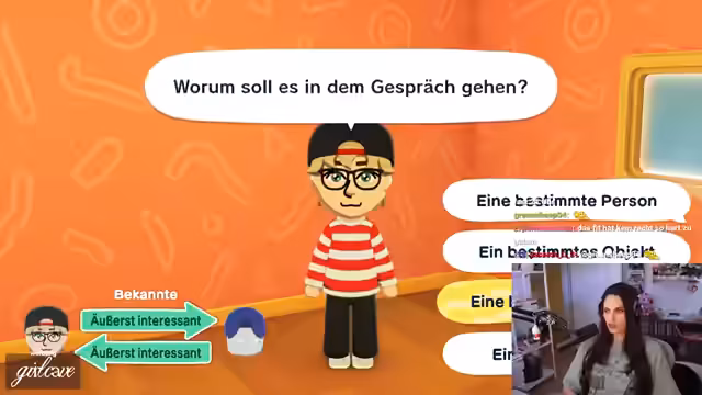 02:39:57Die erstellten Mii-Charaktere beginnen miteinander zu interagieren und Freundschaften zu schließen. Es werden zufällige Begegnungen szenisch dargestellt, bei denen sich die Charaktere vorstellen und gemeinsame Aktivitäten haben. Der Streamer verfolgt die Entwicklung der Beziehungen zwischen den Charakteren und ist begeistert, wie sich die Freundschaften natürlich entwickeln. Es werden auch romantische Beziehungen angedeutet und der Wunsch nach mehr Interaktionen zwischen den Charakteren geäußert.