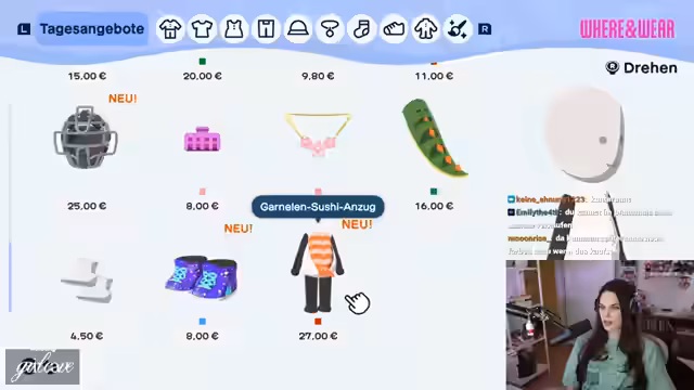 01:34:24Die Streamerin legt besonderen Wert auf die Ausstattung der Charakter mit passenden Outfits. Sie kreiert verschiedene Kleidungsstücke für die Inselbewohner, wie z.B. Business-Outfits für Kevin, und zeigt dabei ein Auge für Styling und Ästhetik. Sie verbringt viel Zeit damit, individuelle Looks für jeden Charakter zu gestalten.