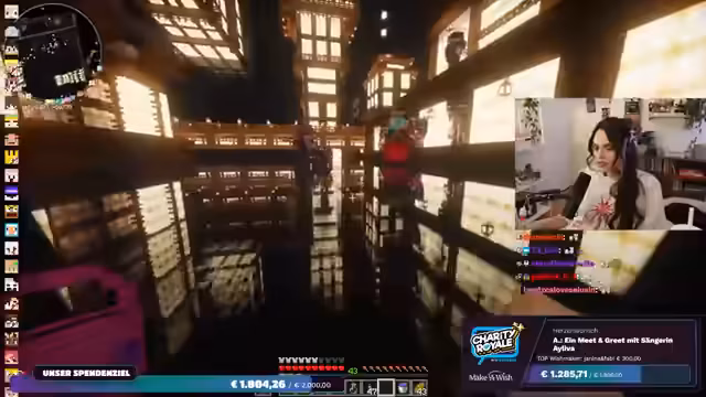 01:33:57Die Teilnehmer werden in Dreiergruppen in das Infinity Castle geschickt, nachdem sie einen Trank des leichten Fallens getrunken und eine Elytra angelegt haben. Dies ermöglicht ihnen, das riesige Bauwerk aus der Luft zu erkunden. Die Reaktion der Teilnehmer ist begeistert, sie sind beeindruckt von der Größe und dem Detailreichtum des Schlosses. Es wird die Möglichkeit geboten, Fragen zum Design und den einzelnen Gebäuden zu stellen, die alle individuell eingerichtet sind. Die Bedeutung von Teamwork wird durch ein Schild mit der Aufschrift „Teamwork!“ hervorgehoben, das an einem der Gebäude angebracht ist. Es wird erwähnt, dass das Team 34 Doppelkisten Sand gesammelt hat, was die enorme Zusammenarbeit und den Einsatz unterstreicht. Die Teilnehmer werden ermutigt, das HUD auszublenden und Raketen zu verwenden, um die Umgebung besser erkunden zu können. Trotz der anfänglichen technischen Probleme scheint die Erkundung des Schlosses ein Highlight des Events zu sein, das die harte Arbeit des Teams würdigt.