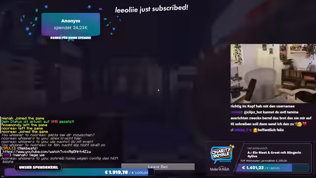 00:09:21Der Streamer begrüßt die Zuschauer an einem Mittwoch und kündigt das bevorstehende „Dress to Impress“ Event an, das heute stattfinden wird. Es wird erwähnt, dass einige Anpassungen an der Teilnehmerliste vorgenommen werden müssen, da sich ein Teilnehmer zurückgezogen hat, was jedoch Raum für neue Teilnehmer schafft. Gleichzeitig wird der Charity Royale Stream hervorgehoben, bei dem Spenden für schwerkranke Kinder gesammelt werden, um deren Wünsche zu erfüllen. Ein Spendenziel von 100 Euro wurde bereits vor Stream-Beginn erreicht, und es wird das Ziel verfolgt, dem Jungen Bastian einen Besuch in einer Traktorfabrik zu ermöglichen. Die Spendenseite ist über einen Chat-Befehl zugänglich und wird für die Dauer des Streams angepinnt. Es wird betont, dass jeder gespendete Euro wertvoll ist und bereits einige Vorab-Spenden eingegangen sind.