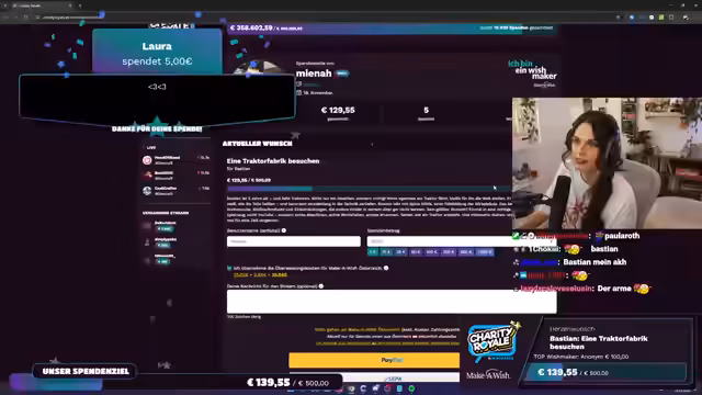 00:28:06Das erste Spendenziel für Bastian, den Besuch einer Traktorfabrik, wurde dank der großzügigen Spenden der Community bereits erfüllt. Dies wird als großer Erfolg gefeiert, und der Streamer drückt seine Freude und Dankbarkeit aus. Daraufhin wird direkt ein zweiter Charity-Wunsch vorgestellt: Ein anonymes zehnjähriges Mädchen namens A träumt von einem Meet & Greet mit der Sängerin iLiver und dem Besuch eines ihrer Konzerte. iLiver ist für A eine große Inspiration, und die Erfüllung dieses Wunsches wäre für sie ein absoluter Traum. Das Spendenziel wird daraufhin auf 1.000 Euro erhöht, um auch diesen Wunsch realisieren zu können. Es wird darauf hingewiesen, dass die Kosten für Anreise, Hotel und Verpflegung ebenfalls berücksichtigt werden müssen, da ein Meet & Greet mit einem Künstler oft teuer ist.