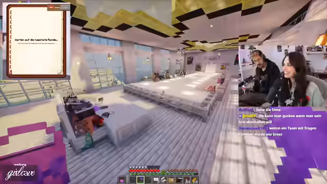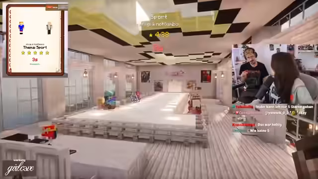 02:55:17Während der Diskussion über die Performance von Basti als Sportacus kam die Sprache auf die LazyTown-Lore, wobei der Streamer überraschend viel Wissen über die Serie preisgab, einschließlich der Tatsache, dass der Schauspieler von Sportacus ein ehemaliger Weltmeister in Aerobic war. Dies sorgte für Erstaunen und Belustigung. Anschließend traten Stegi und Gambo auf, deren Performance ebenfalls sehr positiv aufgenommen wurde. Die Umsetzung, insbesondere die Nutzung von Redstone-Elementen, wurde als „richtig geil gemacht“ gelobt. Die Zuschauer waren beeindruckt von der Kreativität und dem Detailreichtum der Darbietung, die eine hohe Punktzahl im Voting erhielt.