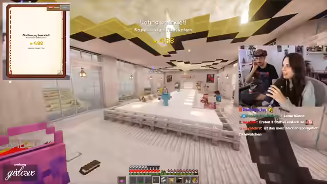 03:40:08Rose und Alphastein präsentierten eine humorvolle McDonald's-Performance, bei der Alphastein eine Bestellung aufnahm und einen Chicken Nugget-Song sang, was für viel Gelächter sorgte. Die Performance wurde als „klasse“ bewertet und erhielt eine hohe Punktzahl. Anschließend folgte der letzte Auftritt des Abends von Gambo und Stegi, das „große Finale des Finales“. Ihre Performance wurde als kreativ und unkonventionell gelobt, obwohl die Details, wie ein Redstone-Block, nicht ganz klar waren. Das Outfit und die unkonventionelle Herangehensweise kamen gut an. Nach allen Performances wurde die Siegerehrung vorbereitet, wobei es Schwierigkeiten bei der Auswertung der Duo-Bewertungen gab, da die Website einzelne Personen statt Duos anzeigte.