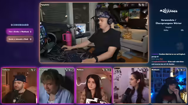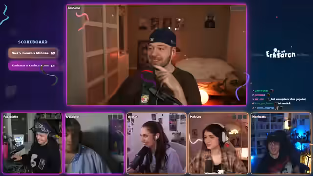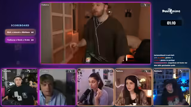 01:08:54Es wird über die Möglichkeit der Chat-Integration diskutiert, bei der der Chat mitraten kann und die prozentuale Trefferquote angezeigt wird. Dies wird jedoch aufgrund potenzieller Spoiler und unangemessener Kommentare im Chat zunächst nicht umgesetzt. Die Teams für die erste Runde stehen fest: Tim, Kroko und Maluna gegen Kevin, Tamina und Nick, wobei später ein Teamwechsel geplant ist. Die Teilnehmer äußern sich über ihre Teamzugehörigkeit und die zu erwartenden Leistungen.