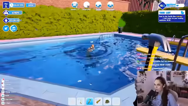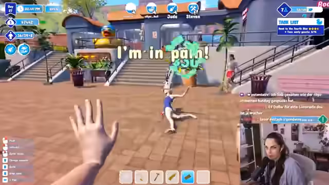 03:45:53Die Streamerin erhält einen Raid von Marcel und bedankt sich dafür. Sie erwähnt, dass sie zuvor Activity mit anderen Streamern gespielt hat. Sie erklärt, dass es ein neues Emote gibt, das den Stream gut zusammenfasst. Anschließend eröffnet sie ihren Wasserpark, den sie Pussypark nennt, für die Zuschauer. Da die Twitch-Integration nicht funktioniert, muss sie mit zufälligen Charakteren spielen. Sie schubst einen Charakter ins Wasser und entschuldigt sich für die Umstände. Sie stellt fest, dass Clips keine Hot Dogs verkauft hat und füllt die Soda wieder auf. Es wird überlegt, warum niemand Hot Dogs kauft und ob es am Layout liegt.