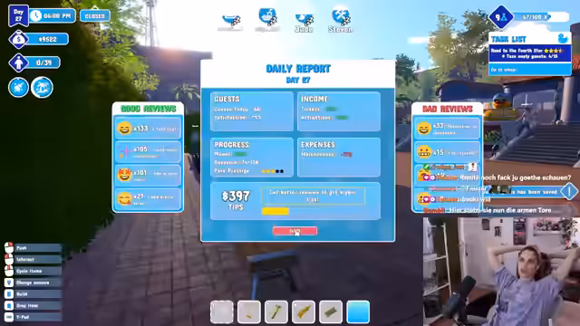 03:56:27Die Streamerin stellt fest, dass einige Gäste gelangweilt sind, obwohl sie neue Attraktionen hinzugefügt hat. Sie bemerkt Müll und wenige Pfützen, was bedeutet, dass ihre Mitarbeiter ihre Arbeit machen. Sie überlegt, ob sie den Kicker und Obstkorb aus dem Pausenraum entfernen soll, da die Mitarbeiter nicht arbeiten. Es wird festgestellt, dass die Mitarbeiter die Attraktionen nutzen. Die Streamerin plant, die restlichen Aufgaben zu erledigen, um morgen perfekt in den Tag zu starten. Sie überlegt, ob sie Clips ins Zelt schicken soll. Sie geht kurz offline, um auf die Toilette zu gehen und danach den Stream fortzusetzen.